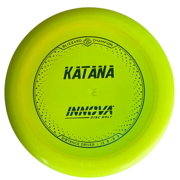 Enkel distanse fra tee. Store turnover-kast og kast i medvind. Innova Katana er bygget for finesse-kasteren. Anbefalt for bruk i medvind. Treff den rette vinkelen og opplev hvordan den forsvinner ut av syne. Fysisk ligner den på en Boss, men med flyegenskapene til en Sidewinder på steroider. Mestre Katana-teknikken – og bli konge på banen. (Champion Katana har noe annerledes flight numbers. [13|5|-2|3])